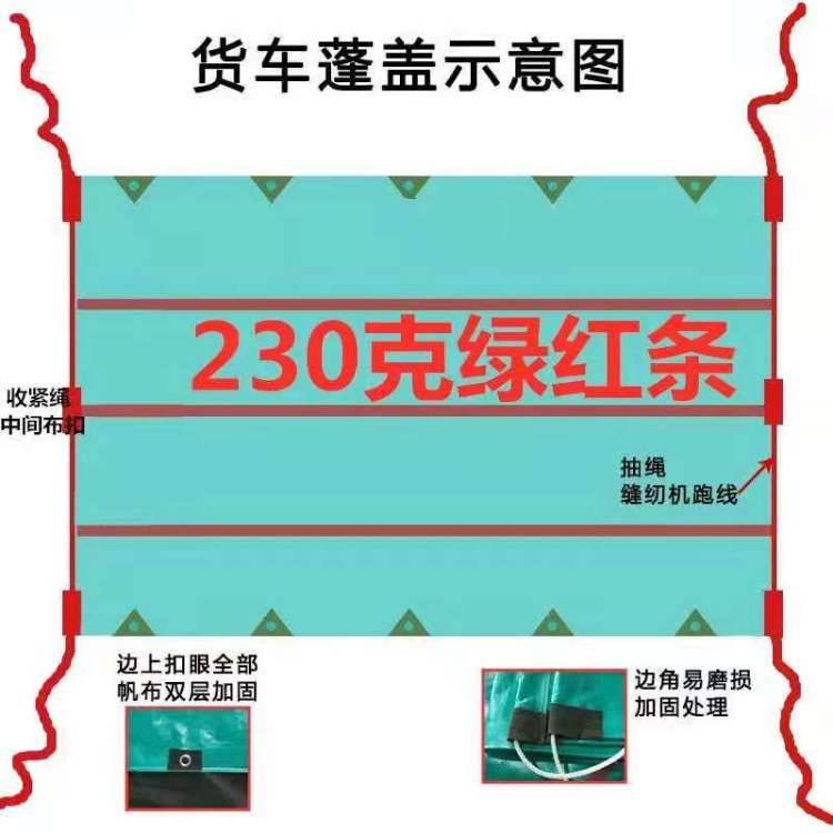 產(chǎn)品介紹綠紅條色PE防水篷布汽車篷布,貨車篷蓋示意圖如上。綠紅條色PE防水篷布高溫?zé)崛燮唇樱瑹o縫拼接不漏水;雙面PE覆膜,雙面防水;金···